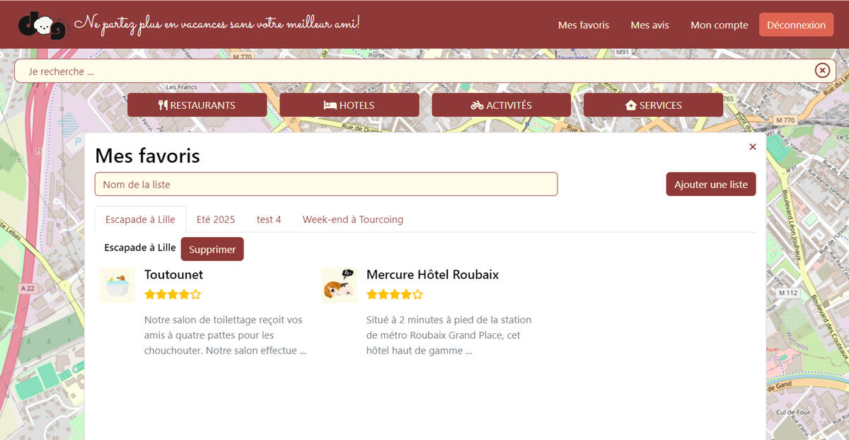 Keep track of your favorite places with the favorites list creation feature. Whether it's to plan your next outings with your dog or to remember the best places you've discovered, easily add the dog-friendly places you love to your personalized lists.